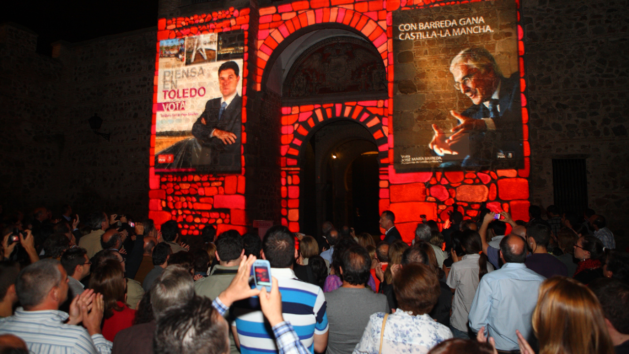 Así se refirió el presidente durante la tradicional pegada de carteles que dio inicio anoche a la campaña electoral. Este acto tuvo lugar en la Puerta de Bisagra de Toledo sobre cuyo patio de armas se realizó una proyección de imágenes.